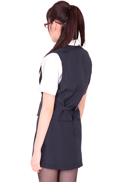 落ち着いた紺色が清楚な秘書の雰囲気を演出!セクシーな胸元の半袖ブラウスとミニスカートに、3つボタンベストのなりきりコスプレ3点セットで、魅力的なOLに変身しちゃおう!