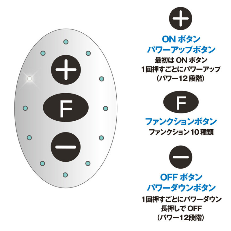●ピンポイントで刺激できるミニローター●ビギナーに嬉しいボタンスイッチ●電源ON&パワーUPは+ボタン●電源OFF&パワーダウンは-ボタン●パターン切り替えはFボタン●12段階の強弱パワー&10種類の振動パターン●飽きさせない全120種類の快感振動●12個のLEDランプ付き・振動の強さによって順番に点灯●静音・生活防水仕様●単四電池×2本使用。