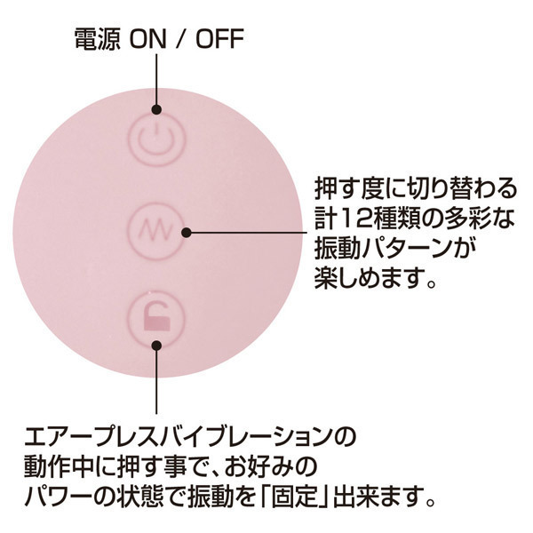 「エアープレスバイブレーション」の動作中にお好みの振動パワーのまま固定できるロックボタンを配置!また、バルーンによる振動の強弱以外にも、ボタンプッシュで切り替わる12種の振動パターンも搭載しています。