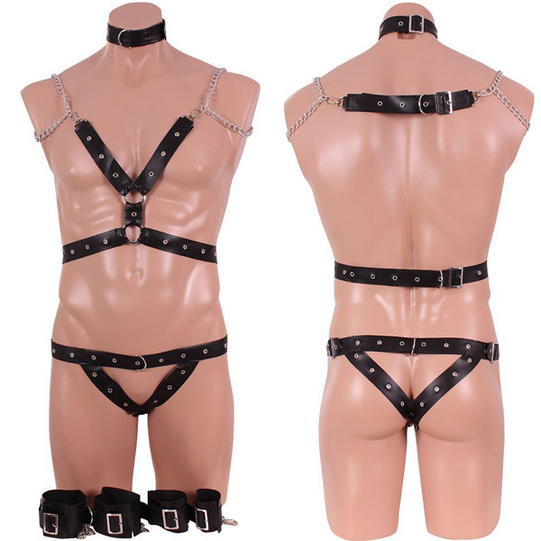 ●スタッズが付いたレザー風●肩チェーン付きトップス●サイド調節可のオープンショーツ●ベルト式の首枷、手枷、足枷●リング付きで連結可能。