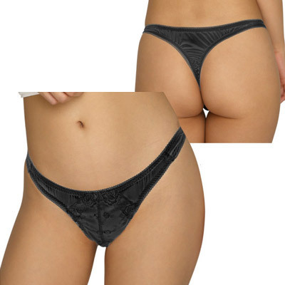 ●シックなブラックカラー●サラリとした光沢フェリカ生地●フラワーレースの大きめポケット●クロッチ部分にスリット入り●セクシーなTバックタイプ。