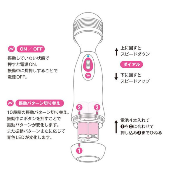 パッケージ:20.5×6.8×6.8cm 本体:全長19.5cm ヘッド部直径4.5cm 持ち手太さ4.2〜4.7cm 重量:179g 電池:単三電池×4本使用(電池は付属していません)