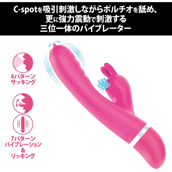 女性の一人エッチにピッタリなF型フォルムが使いやすい、クリ吸引機能とバイブレーション機能を備えた2点責めバイブ!Gスポットを震わせるパワフルな振動と、クリに密着して吸引され敏感にしてくれる同時責めはヤミツキ必至!C−spotを吸引刺激しながらポルチオを舐め、更に強力震動で刺激する三位一体のバイブレーター!唇に包まれながらチュパチュパと小刻みに吸い付く優しい刺激。