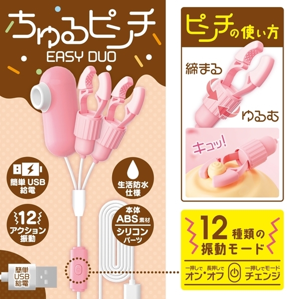 USB給電式の吸引&ニップルローターです♪挟む力を回して調整でき、吸引とピンチを同時に楽しめるダブルタイプです!12種類の振動モードを搭載し、ピンチ部分と吸引部にはシリコンカバーが付いているため、優しく包み込むような感触を提供♪本体重量76gと超軽量で、上下同時に使用しても快適です!モバイルバッテリーやUSBアダプターから給電でき、使用場所を選ばず楽しめる便利なアイテムです♪