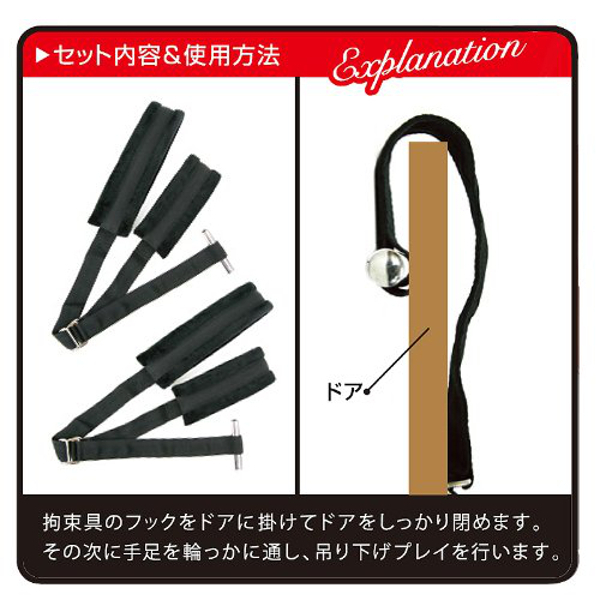 ドアの上部にフックを噛ませて腕と脚を固定!吊り下げ拘束が簡単にできるSMグッズ。