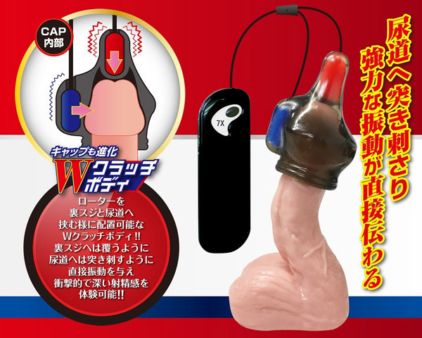 亀頭キャップ自体もローターを裏スジと尿道へ挟むように配置できるWクラッチボディへと進化!裏スジへは覆うように、尿道へは突き刺すように直接振動を与えます。