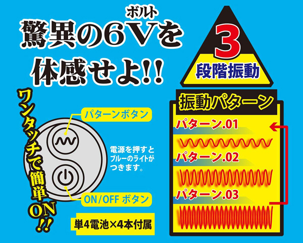 簡単な操作でパワフルな快感!6ボルトの振動を手軽に楽しめるシンプルなシングルローターです。