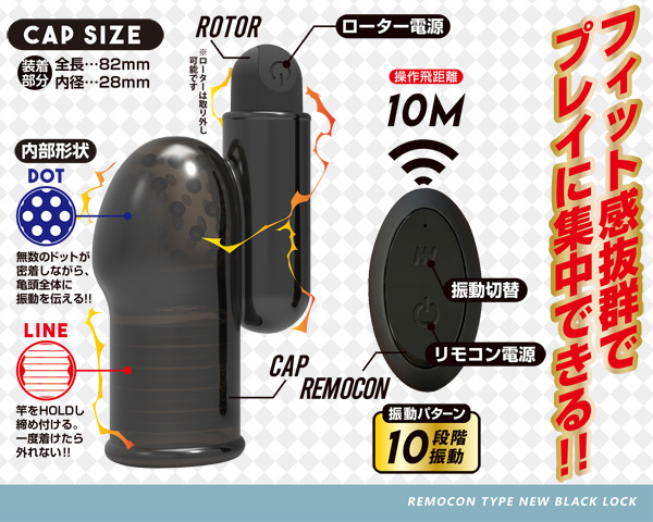 フィット感抜群のキャップ内には密着感を高めるドットと横溝を配置!サオをギュッと締め付けながら亀頭を細かに刺激する!振動は10段階搭載、操作飛距離は10mまで対応。