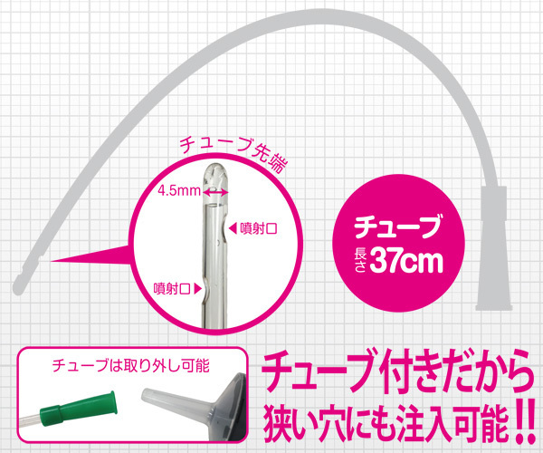 全長19.5cm、筒先の長さ3.5cm、容量は最大350mlまで対応!2箇所の噴射口が付いたチューブなら狭い穴でも簡単に奥まで注入できます。