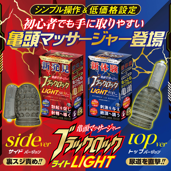 亀頭を刺激するキトニーローター「ブラックロック」のライト版、「ブラックロック ライト」が登場♪マイクロローターをポケットに装着する仕様でサイドとトップの2タイプを展開!こちらはトップバージョンで、尿道周辺を振動するポケット位置が特徴。