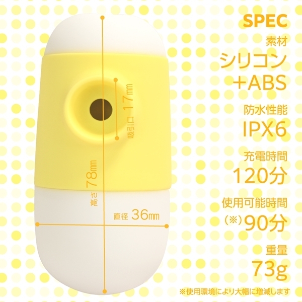 手にフィットするエッグスタイルの吸引ローターです♪可愛らしいデザインに、高性能な静音モーターを搭載しています!タマゴ型フォルムの上部にボタンを配置し、片手でもスムーズに操作可能です♪吸引口には柔らかく高品質なシリコン素材を採用し、ピンポイントにしっかりフィットして快適な真空状態を演出!7パターンの吸引アクションを搭載しており、強弱の調整も自在に楽しめます♪約120分で満充電でき、最大約90分間の連続使用が可能!(使用環境により変動します!)さらにIPX8相当の高い防水性能を備えているため、使用後も丸洗いできて衛生的です♪コンパクトながら多機能な、使いやすさにこだわったアイテムです!