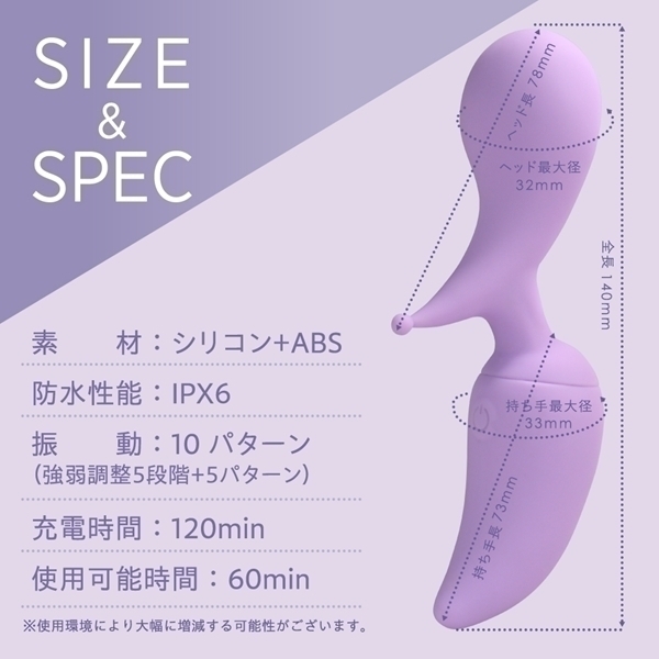 ピンポイント刺激とズンズン響く電マ刺激の両方を楽しめる勾玉型デンマです♪2WAYヘッド仕様で、ネック部分に角度をつけた設計によりセルフケアにも最適!高品質な静音×高速振動モーターを搭載し、細かい5段階の強弱調整が可能です♪さらに実用性の高い5つの振動パターンも加わり、合計10パターンのバリエーションを楽しめます!オールシリコンボディで、しっとりとやさしい肌ざわりがストレスフリーな使用感を演出♪約120分の充電で、最大60分の連続使用が可能です!(使用環境により変動します!)IPX6相当の防水設計で、水洗いできるため清潔に保てます♪毎日のリラックスタイムをサポートする、使いやすさにこだわったアイテムです!