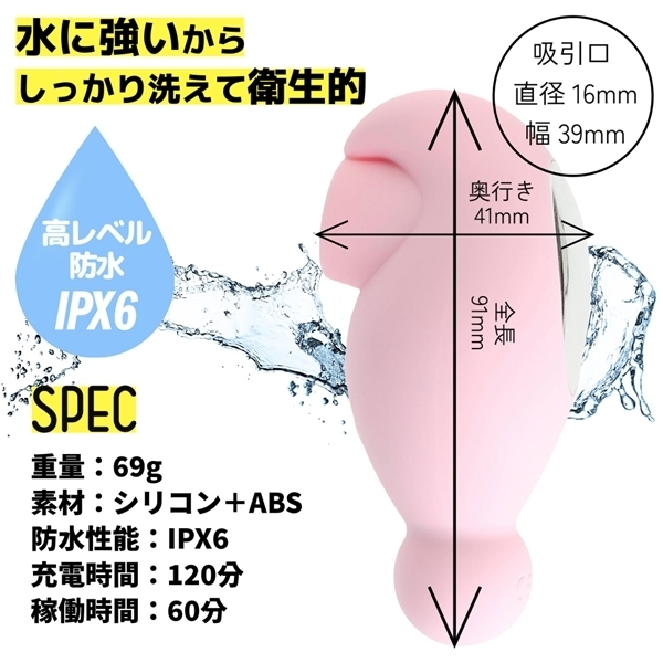 吸引と振動を同時に楽しめるコンパクトな外用グッズです♪吸引口上部にマイクロモーターを搭載し、吸われながらブルブル振動のW刺激を演出!吸引は強弱3段階と4つのリズムパターン、振動は5段階の強弱調整と7つのリズムパターンを搭載し、それぞれ自由に組み合わせ可能です♪直径16mmの吸引口がしっかりフィットして、快適な使い心地を実現!本体は全長10cm以下とコンパクト設計で、重さもわずか69gなので手が疲れにくいのもポイントです♪静音設計とIPX6相当の防水性能で、使用後も丸洗いできて衛生的!(使用環境により大幅に変動します!)滑らかで肌ざわりの良いシリコンボディが快適な使用感をサポートします♪