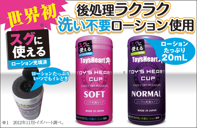 トイズハートのこだわりが詰まったオナカップが登場!カップ上部には、ローションの乾きを防止する厚めのフタを採用!後処理の簡単な洗い不要ローションがたっぷり充填されているので、ヌキたい時にすぐ使えます!こちらは大きくワインディングした膣内の大型イボが、確実な刺激をもたらす「ノーマル」タイプ!内部は内圧を最適化する「EXウレタン」を使用し快感もアップ!底部にはカップ内の空気を開放できるバルブも付いた、とっても便利なオナカップです。
