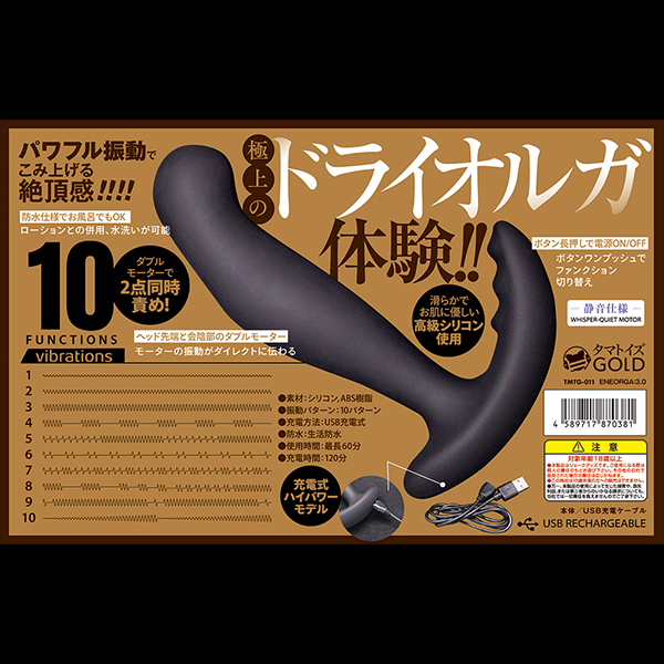 前立腺と会陰のニ箇所を刺激してくれるアナルバイブ「ENEORGA3.0」です♪強弱含む10種類の振動パターンを搭載した豊富な振動バリエーションが自慢でボディはシリコン製!比較的ストレートで扱いやすく、先端の膨らみは前立腺にフィットしやすくネックは細身♪入れっぱなしでもアナルへの負担が少なく初心者でも挿入しやすくなっています!会陰を刺激するウェーブ状の突起が付いた部分にはモーターが内蔵されており、挿入シャフト先端の内蔵モーターと連動して絶妙な振動刺激を与えてくれます♪電源はUSB充電式で120分のフル充電で連続稼働60分!生活防水仕様なのでプレイ後に丸洗いできてメンテも簡単♪豊富な振動バリエーションでドライへと導いてくれます。