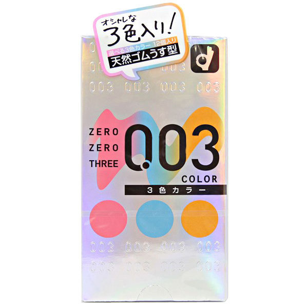 その日の気分で楽しめるピンク、ブルー、オレンジの3色入り!超極うす0.03mmの素肌感覚コンドーム(12個入)。