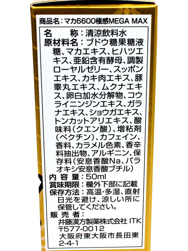 冴える感度!速攻ショット!?「マカ6600極感MEGA MAX 50ml」です。マカ6600mgとヒハツ300mgが入った製品。カフェインが入っているので敏感な方へのご利用はお避け下さい。