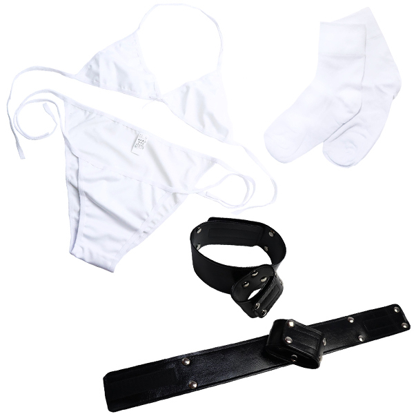 パッケージ:28.0×18.0×7.0cm 本体:フリーサイズ(マジックテープ) セット内容:手枷、もも枷、ブラ、パンツ、ソックス 重量:254g 日本製