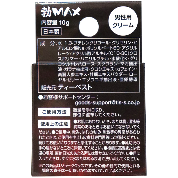 眠った本能を覚醒させる!男性をサポートする純国産のラブクリーム10g。マカ抽出液や高麗人参エキスなどを配合!適量を手に取りサッと塗るだけで、自信のない夜を熱く燃え上がらせる♪