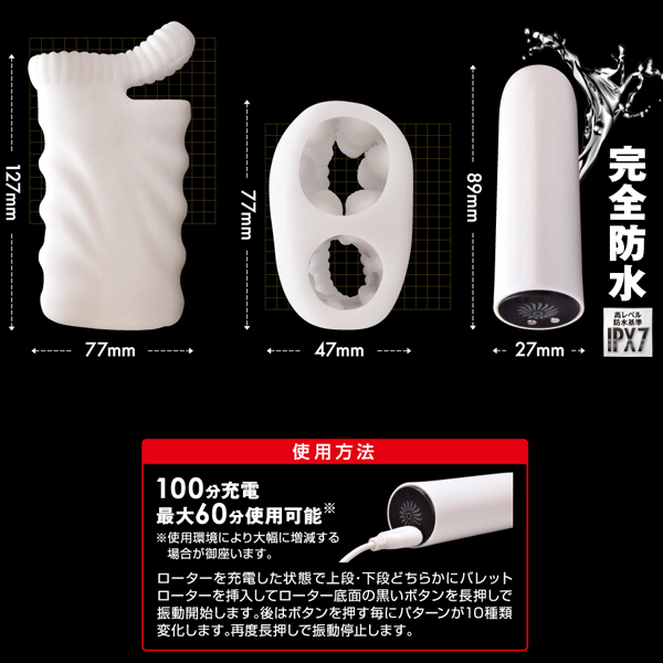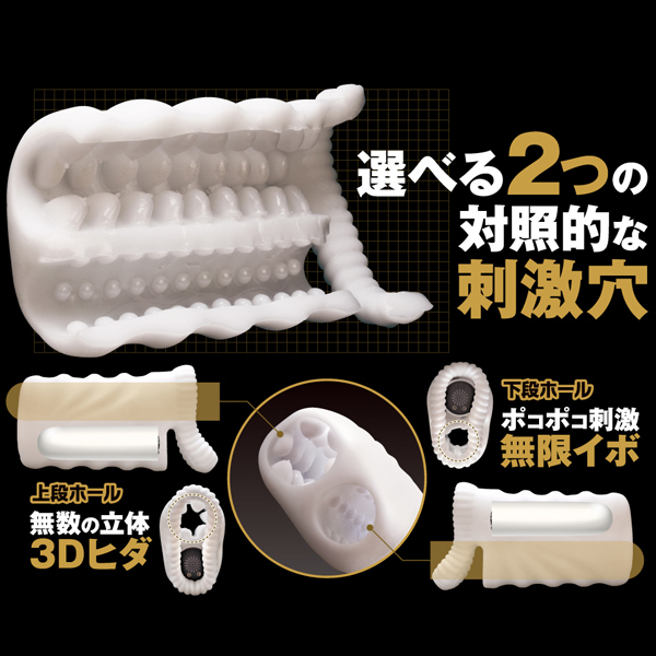伸縮性抜群のもっちりふわとろな高品質シリコン素材を使用した、立体的な3Dヒダと無限イボの異なる刺激が選べる2穴仕様のオナホと、ハイパワーローターのセット!振動は全10種類を搭載、IPX7の完全防水仕様でお手入れ簡単。