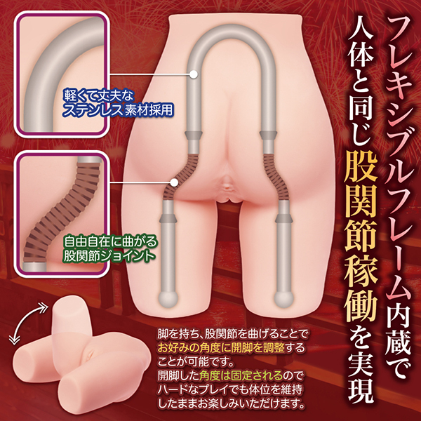 フレキシブルフレームによる股関節可動で正常位では締まりが変わり、後背位ではリアルなお尻を突き出すポーズが、安定した騎乗位や股下デルタによる素股も楽しめる!軽くて丈夫なステンレス素材を採用しているので開脚の調整によるハードなプレイでも安心。