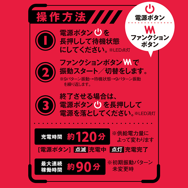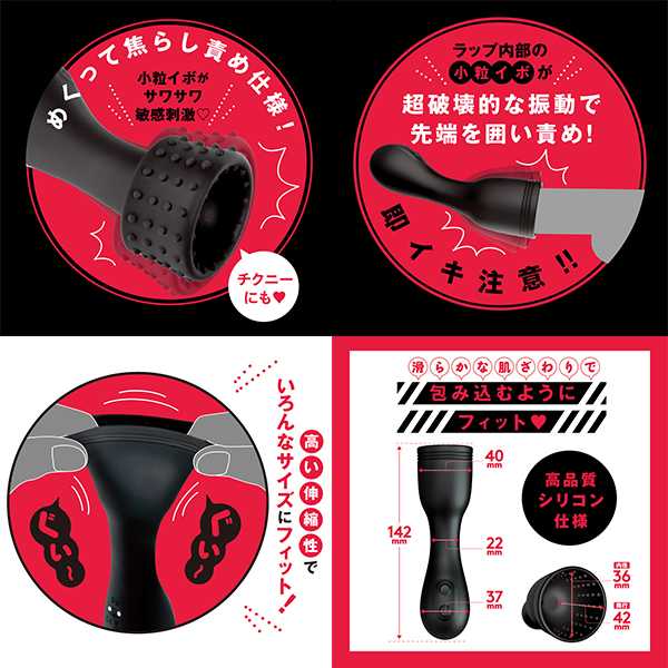 敏感ゾーンを包み込んで超集中刺激!!即イキ注意!!肌ざわり滑らかな高品質シリコン仕様&高い伸縮性でいろんなサイズを包み込むようにフィット♪敏感な先端をラップ内部の小粒イボが超破壊的な振動で囲い責めするローターです!ラップをめくって焦らし責め仕様!小粒イボがサワサワと敏感に刺激!チクニ―にもオススメ♪充電時間約120分、最大連続稼働時間約90分(初期振動パターン未変更時)。