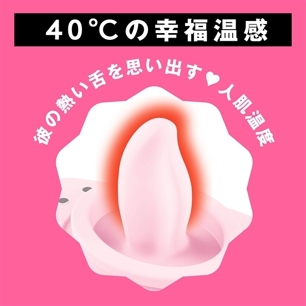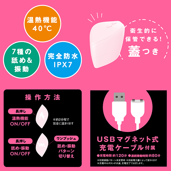 アツくて甘〜い愛のご奉仕クンニ_超!愛を感じる舐めローター!彼の熱い舌を思い出す温感機能は40℃まで温まる人肌温度_先っぽで刺激するチロチロクンニからグイグイ舐め上げる激しいクンニまで多彩なクンニが楽しめちゃう_さらに7パターンの振動機能付き!震えるあったかベロでとろける濃密前戯_やっぱりクンニがナンバー1!!!完全防水なので使用後のお手入れもラクチン♪敏感な部分に直接使うものだから、優しい肌あたりの高品質ソフトシリコンを使用しました。