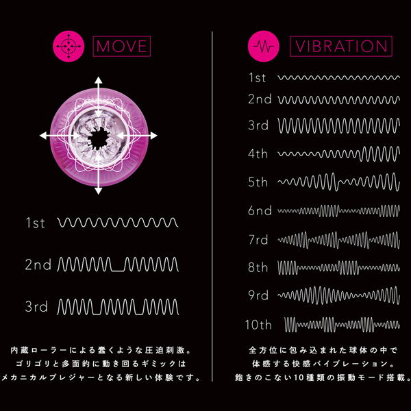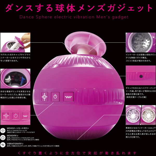 蠢くように動き乱れる新感覚ギミック搭載!お洒落な球状デザインが特徴的な電動型オナホ(貫通式)。