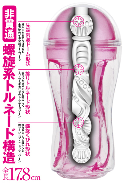 ドーム状にすっぽり包む挿入ゾーンから、肉ミゾがぎゅるりと絡むトルネードゾーンに、搾って捻れるキツフィニッシュゾーン、とトルネードのようなワンダフルな快感をご体験ください!